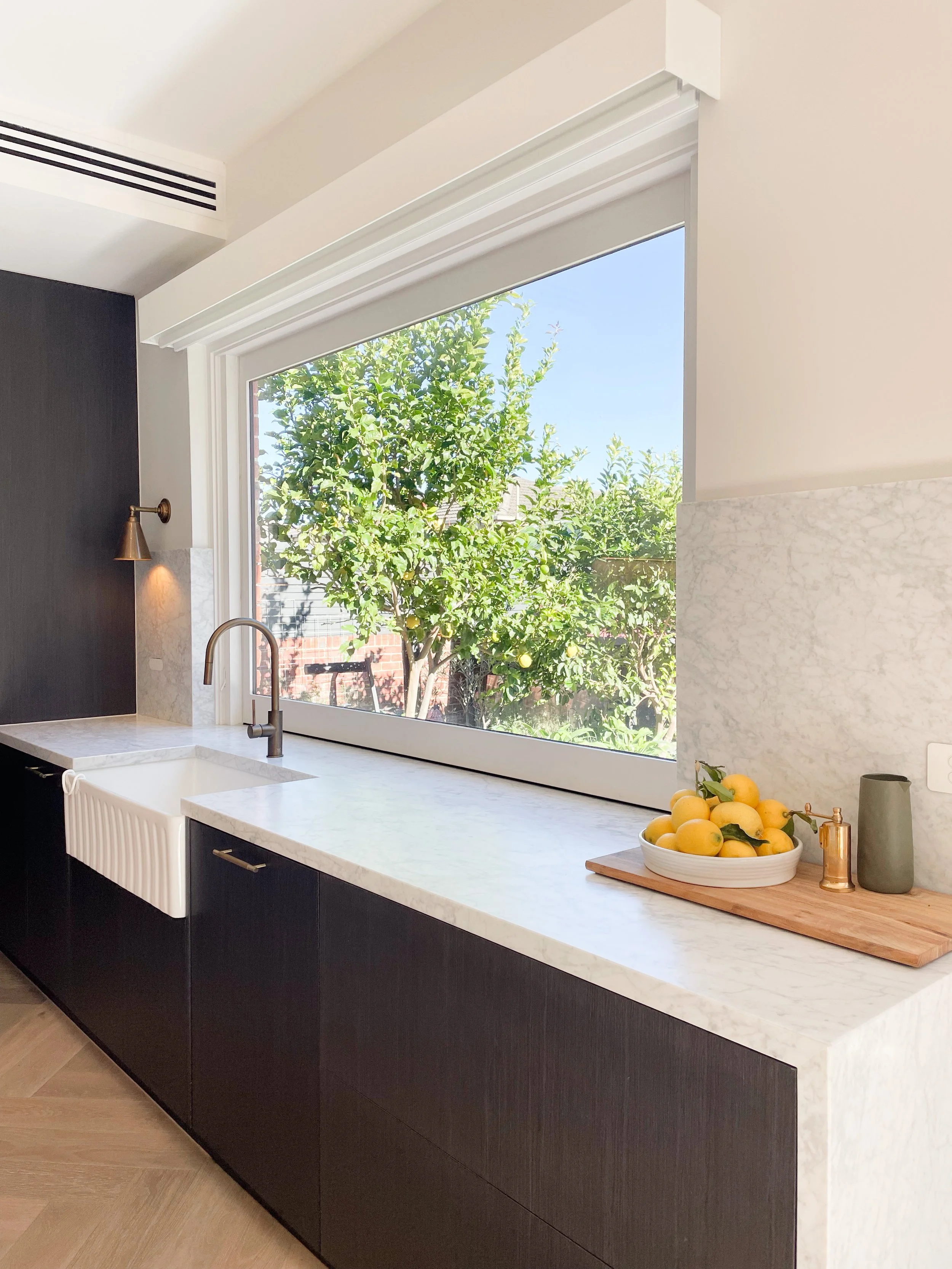 New external openings, including a large kitchen awning window, flood the living area with natural light, drawing attention to the new flooring, fresh plasterwork and custom joinery fitted throughout.